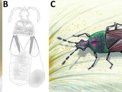 A:将Shaykayatcoris michalskii纳入9900万年前的琥珀中。B:昆虫的重建轮廓。C:新...