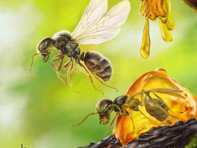 吉蚁婚飞场景复原图。 刘野绘琥珀中的吉蚁雌性繁殖蚁样本。 庄宇辉摄(蜘蛛网eeook...