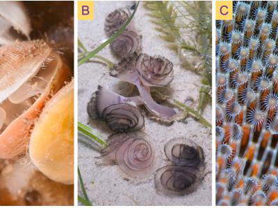图1: 现生触手冠动物的基本形态 A.腕足动物(海豆芽) B.帚虫动物(马蹄虫) C.苔藓...