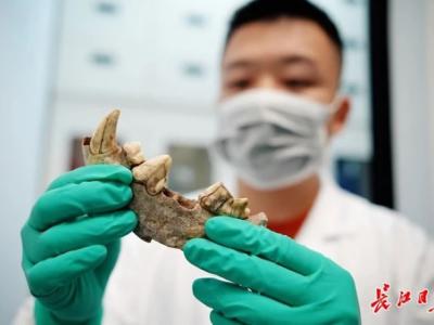 胡家铭展示斑鬣狗化石。长江日报记者何晓刚 摄吉林通化大安溶洞古虎化石(蜘蛛网ee...