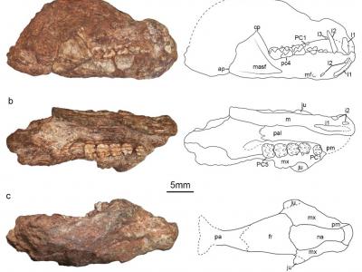 纤弱禄丰兽CVEB12001头骨及右下颌纤弱禄丰兽(A,B)与云南卞氏兽(C)齿冠形态对比...