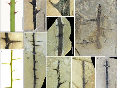 图1. 青藏高原中部晚始新世(约39 Ma)7种形态类型的植物刺化石及现生带刺植物(a,...