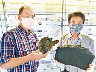 陈龙生(左)手持的菊石化石,与龙德骏手持的痕迹化石,均为在港发现迄今最大的同类...