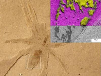 蜘蛛化石白色方框内为扫描电镜图像位置,右上为硫(黄色)和硅(粉红色)化学图像(...