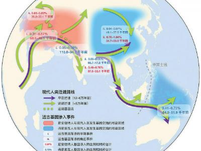 现代人类史前迁徙路线及其与远古人类的基因交流模式示意图(蜘蛛网eeook.com报道)...
