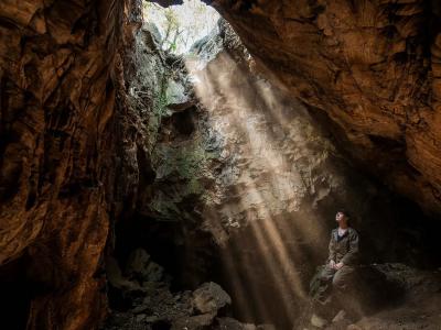 人类学家Marina Elliott坐在南非升星岩洞系统的入口处。她的团队在洞穴蜿蜒的隧道网...