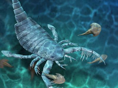 秀山恐鲎生态复原,杨定华绘一只巨大混翅鲎准备捕食无颌类骨甲鱼(引自盖志琨、朱敏...
