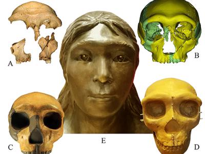 华龙洞6号头骨面貌复原A:华龙洞6号化石;B:虚拟复原头骨;C:实体复原头骨;D:雕...