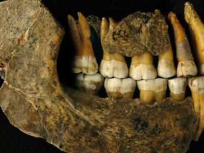 一块哺乳动物头骨化石,牙齿窝里的沉积物,原来是史前蜜蜂筑的巢穴。图片来源:拉萨...