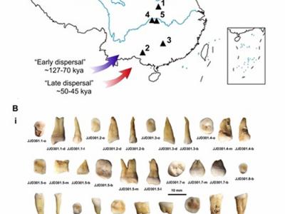 A.该研究涉及的与现代人类起源相关的遗址。1-湖北郧西县黄龙洞、2-广西田东县陆那洞...