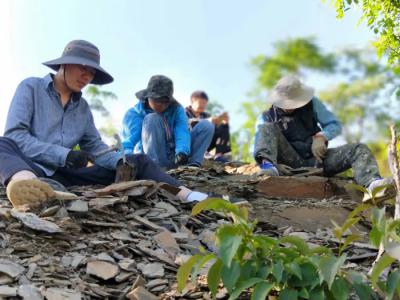 孙智新( 左一)与导师和团队成员一起发掘范特西虫化石。受访者供图。范特西虫复原...