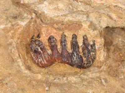 一块哺乳动物头骨化石,牙齿窝里的沉积物,原来是史前蜜蜂筑的巢穴。图片来源:拉萨...