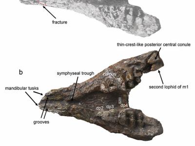始轭齿象下颌(a,1978发表的原始图片;b,标本目前的状态,冠面;c, 标本目前的状...