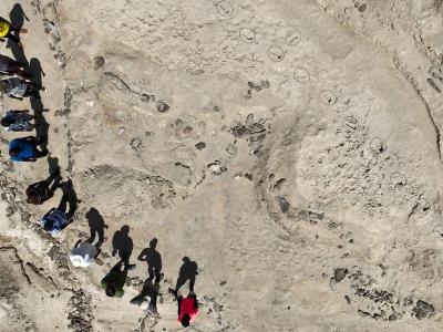 一张挖掘脚印的航拍照片,研究小组成员站在旁边。(图片来源:图尔卡纳盆地研究所和...
