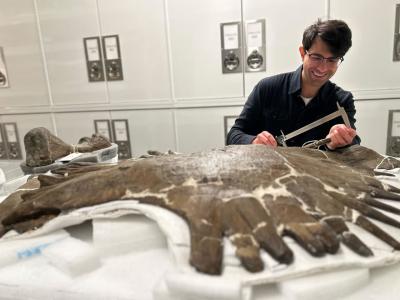 古生物学家凯勒布·戈登在耶鲁皮博迪博物馆测量古代龟骨。图片来源:耶鲁皮博迪博物...