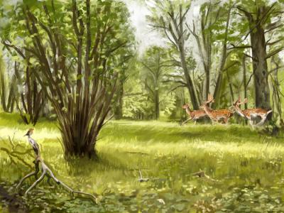 艺术家对古代温带欧洲开阔林地的渲染。图片来源:Brennan Stokkermans(蜘蛛网eeoo...