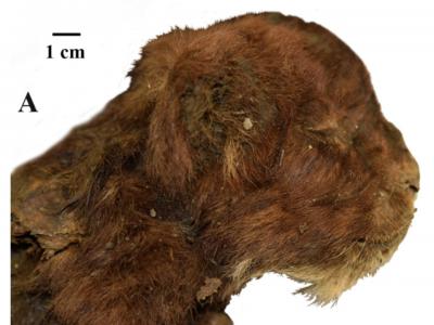西伯利亚永久冻土中出土的一只年轻剑齿猫的木乃伊头。(图片来源:Lopatin等人,《...