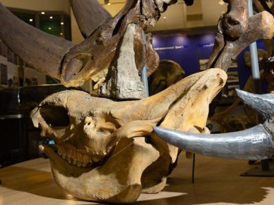 在博物馆里,在放置在头骨化石上的木乃伊尸体旁边发现的长毛犀角。(图片来源:Mic...