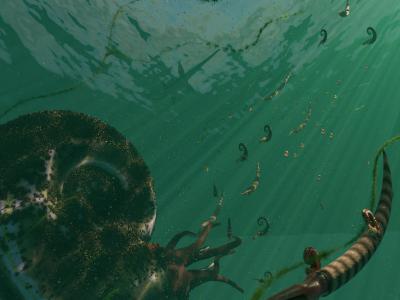 菊石沐浴在白垩纪晚期的阳光下。鸣谢:卡勒姆·普索尔的作品(蜘蛛网eeook.com)据布...