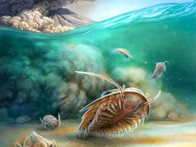 5.1亿年前,在火山灰流中埋葬前的瞬间,两种三叶虫的艺术重建。©A.El Albani教...