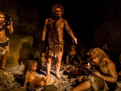 洞穴中尼安德特人群体的重建。一项新的研究发现,尼安德特人照顾一名患有唐氏综合症...