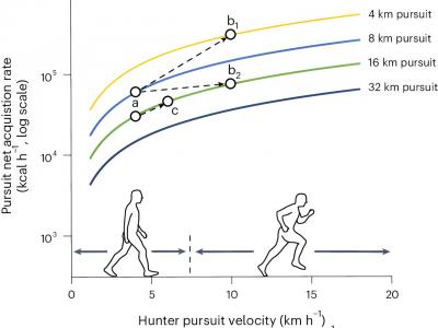 在4-32公里的追逐距离内,羚羊的模拟追逐净捕获率是猎人速度和步态的函数。随着猎人...