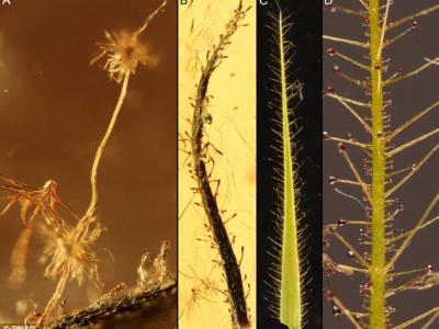 照片中的A和B是保存在始新世波罗的海琥珀内的食虫植物叶子。它们看上去和今天捕虫...