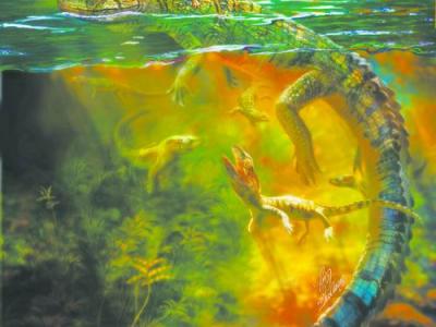 复原图:发现由6个幼年个体围绕一个成年个体组成一个家庭的离龙类——朝阳喜水龙...
