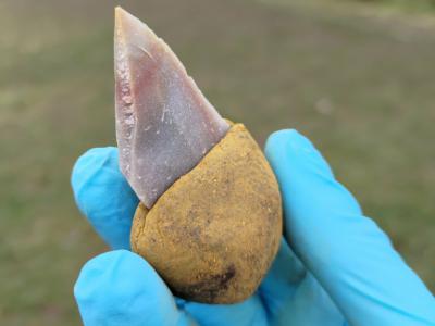 石器被粘在由液态沥青加55%赭石制成的手柄上。它不再发粘,可以轻松处理。作者:帕特...