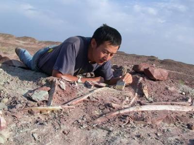 资料图:徐星研究员在新疆准噶尔盆地侏罗系地层中采集恐龙化石(蜘蛛网配图) (...