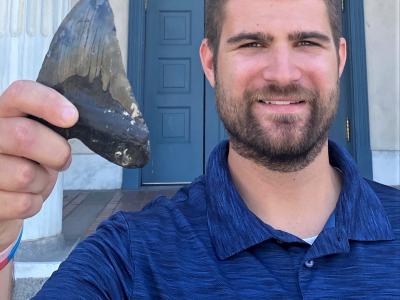 加州大学河滨分校生物学家和论文第一作者菲利普·斯特恩斯拿着一颗巨齿鲨牙齿。鸣谢...