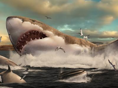 一位艺术家对一条敦实的巨齿鲨的印象。科学家们现在认为它要纤细得多。(蜘蛛网eeo...