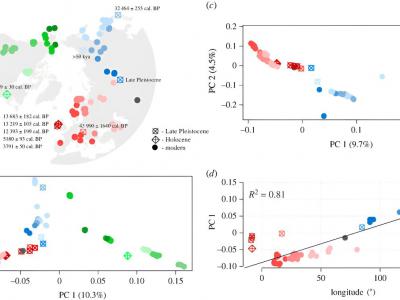 棕熊取样地点和种群结构。(a)显示所分析的古代和当代棕熊基因组所在地的地图。古...