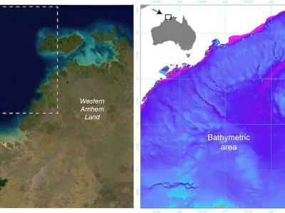 左图:淹没的西北陆架区域的卫星图像。右图:研究区淹没景观图。鸣谢:美国地质调查局...
