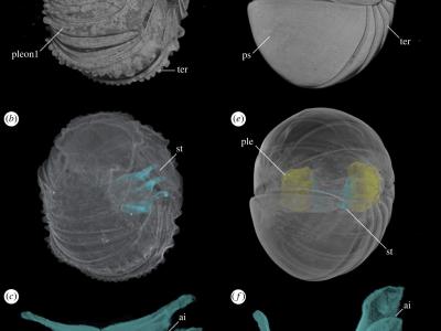 陆生等足类和球足类千足虫登记时的胸骨组织。(a–c)陆生等足类动物的显微CT扫描MCZ...