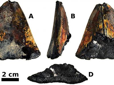 巨齿鲨牙NA141-006-01-MT. A,唇侧观;b、侧面图;c、语言观;d、基底视图。比例尺...