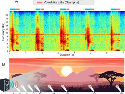 猩猩类辅音和类元音叫声的频谱图(上图)和实验装置(下图)。鸣谢:科学报告(2023)。DO...