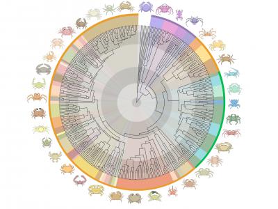 按分类总科着色的真蟹类的系统发育和分歧时间估计概要。鸣谢:乔安娜·沃尔夫、哈维...