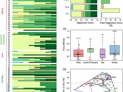 早更新世人类栖息地组成。(a)个别重建中不同植被类别的比例分数。横杠前面的数字指...