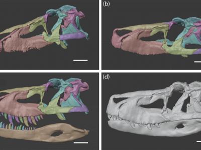重建的galilei Saurosuchus颅骨解剖(PVSJ 32)。(a)分段标本的数字模型,(b)具有重新...