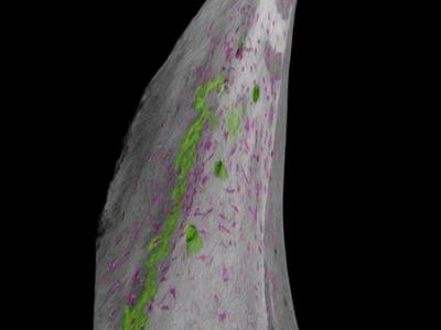 重建一个单一的鲟鱼鳞甲,近摄。骨形成细胞用洋红色标记。信用:J. Stundl(蜘蛛网e...