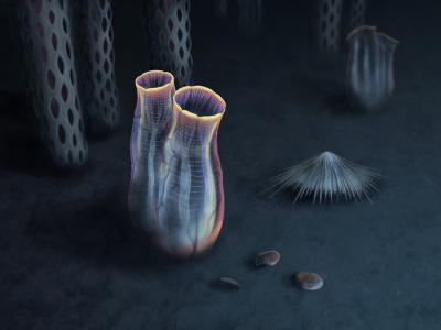 Megasiphon thylakos的艺术重建,一种直接生活在海底的底栖生物。Megasiphon thyla...