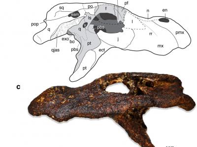 蒙氏短吻鳄头骨。11月正模式标本(DMR-BSL-2011-2)和示意图,分别为右(a,b)和左(c,...