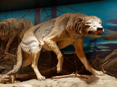 拉布雷亚沥青坑和博物馆展出的恐狼重建照片。鸣谢:洛杉矶县拉布雷亚沥青坑博物馆和...