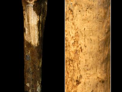 人类胫骨和显示切割痕迹的放大区域的视图。比例= 4厘米。信用:詹妮弗·克拉克。(蜘...