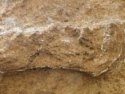 我们人类已知的最古老的脚印,用粉笔轻轻圈起来。它看起来又长又窄,因为跟踪者拖着...