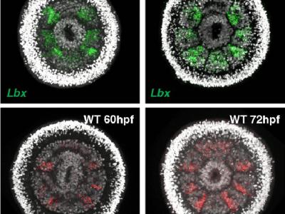 荧光图像显示两个必需片段极性基因在60hpf(受精后数小时)和72hpf时的基因表达。鸣谢...