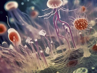 艺术家想象的居住在海底细菌垫上的“原甾醇生物群”的原始真核生物集合体。根据分子...