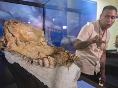 秘鲁发现世界上保存最完好的700万年前抹香鲸化石(Photo by Cris BOURONCLE / AFP)(...