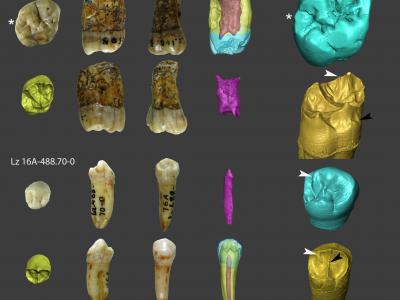 Lezetxiki的牙齿残骸。在左侧,牙齿以咬合、近中、舌侧(顶行)、远侧和颊侧视图(底行...